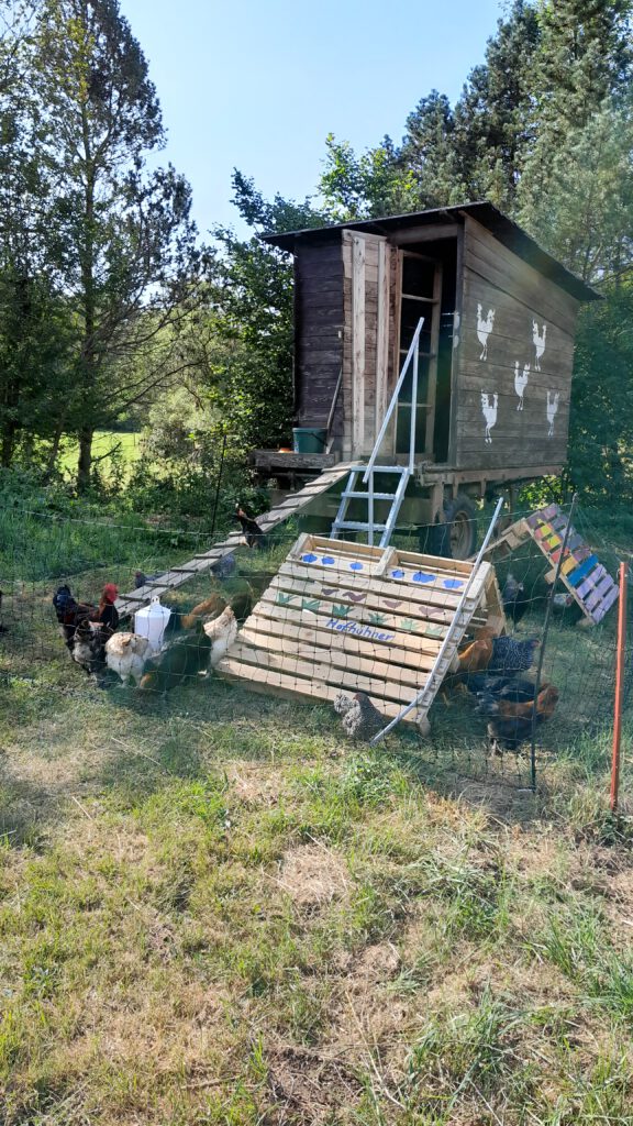 Unsere bunte Hühnertruppe besteht aus unterschiedlichsten Rassehühnern, die uns mit Eiern in allen möglichen Farben beglücken. Jedes Jahr im Frühjahr brüten wir außerdem Küken aus, deren Aufwachsen wir vom ersten Tag an beobachten und begleiten können.